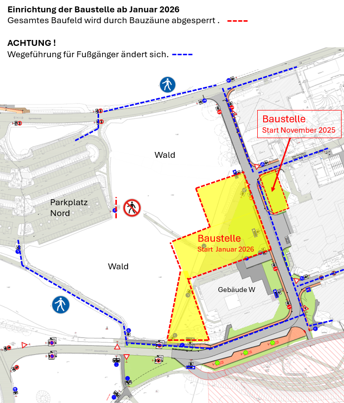 *-----------------------------------------------------------------------------------------------------------------------------------------------------------------------* *Forum Konstanz Gebäude WA: Beginn der Bauarbeiten* ** Die Bauarbeiten für das Forum Konstanz starten. Ab November 2025 wird die Fläche vor Gebäude P für die Bauleitungscontainer hergerichtet. Ab Januar 2026 wird das gesamte Baufeld um das Gebäude W durch Bauzäune abgesperrt. Eine Infoveranstaltung über den Baustellenverlauf „Gründung und Erdaushub“ folgt Anfang Dezember.